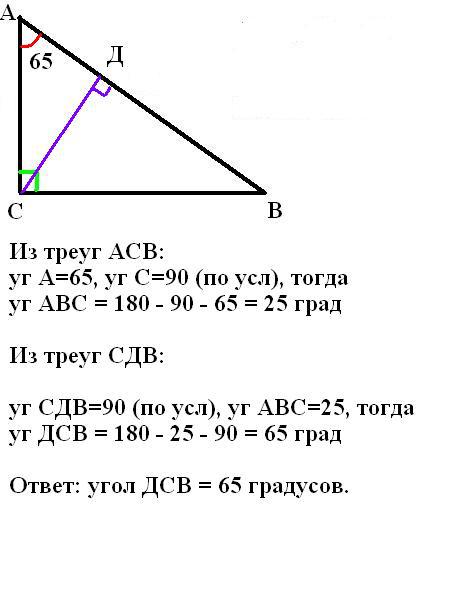 из вершины прямого угла треугольника Абс проведена высота СД .Найти величину угла ВСД если угол А равен 65 градусам