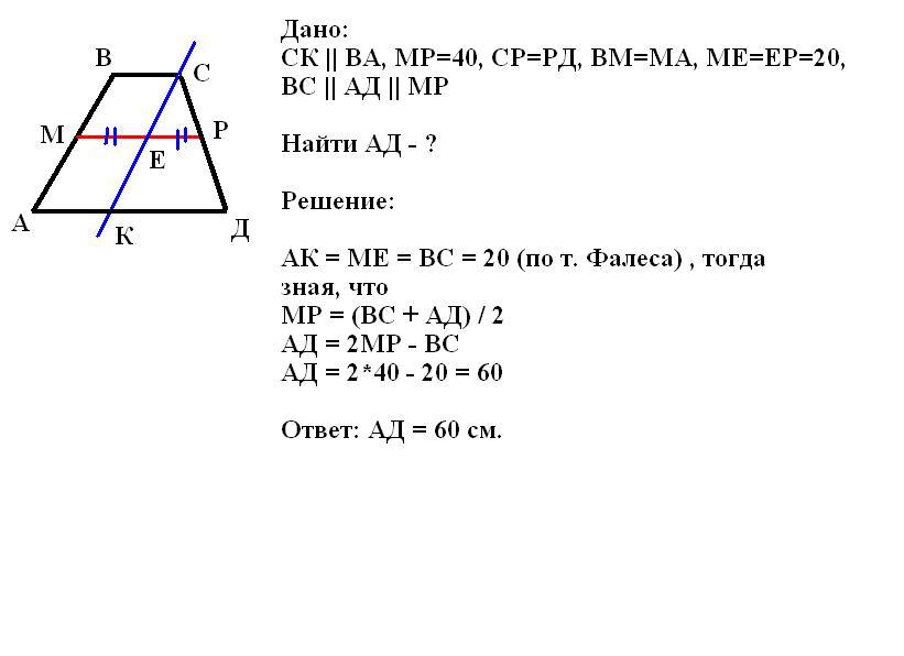 если средняя линия равна 40 по условию, то большее основание будет в любом случае больше 40, так что уточняйте задание
