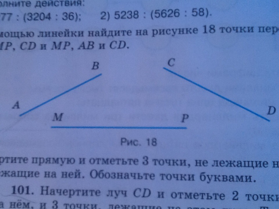 С помощью линейки найдите на рисунке 18 точки пересечения прямых AB и MP,CD И MP, AB И CD.