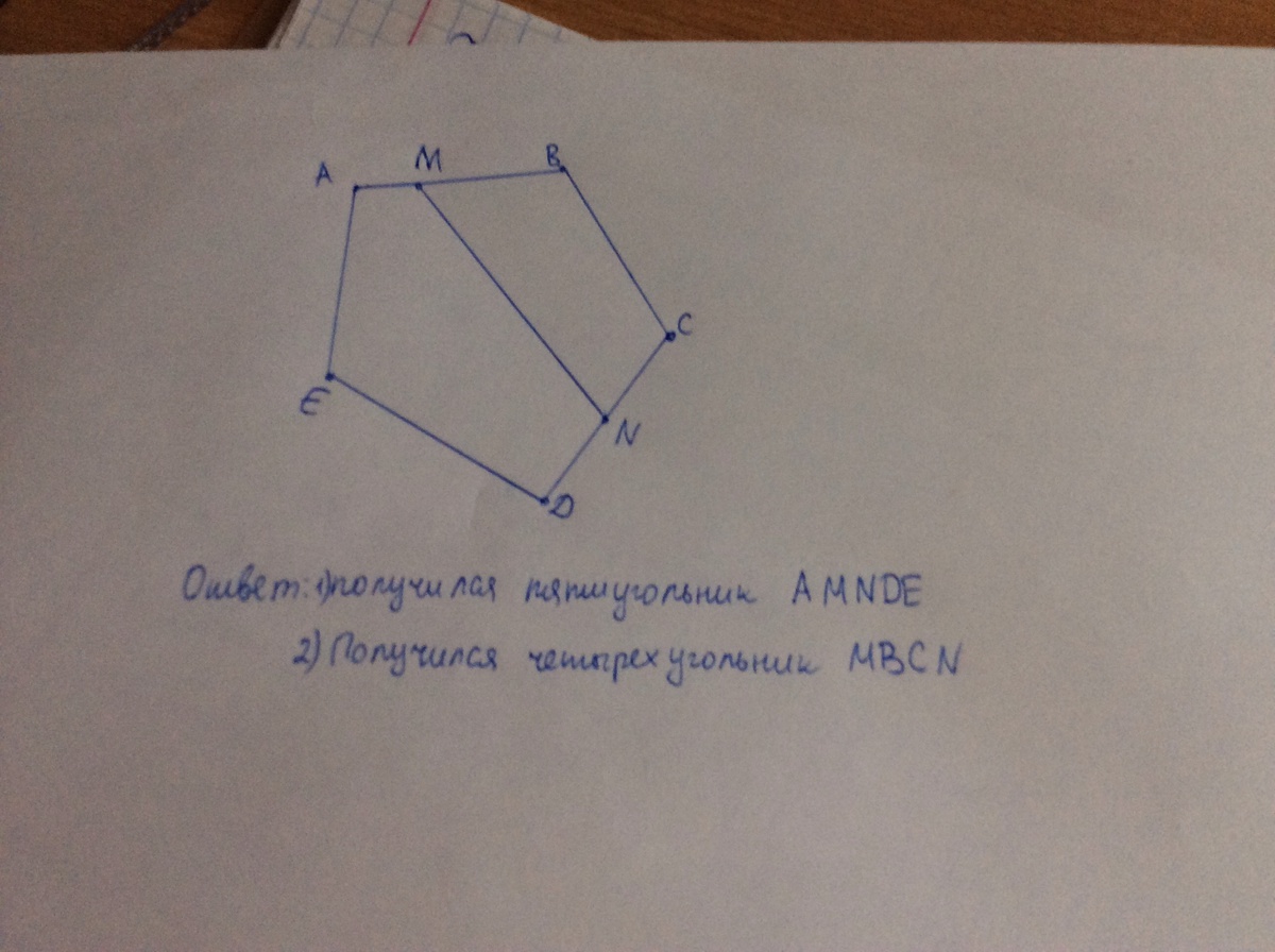 Начертите пятиугольник АВСDE. Отметьте точку М на стороне АВ и Точку N на стороне СD. Соедините точки М и N отрезком. Какие получились многоугольники? Назовите их