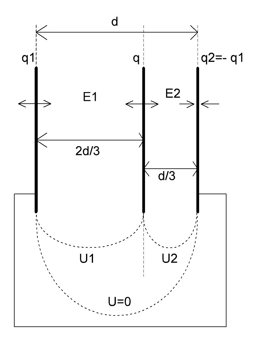 (q1-q-q2)1/(2ee0S)*d*2/3+(q1+q-q2)*1/(2ee0S)*d*1/3=0
