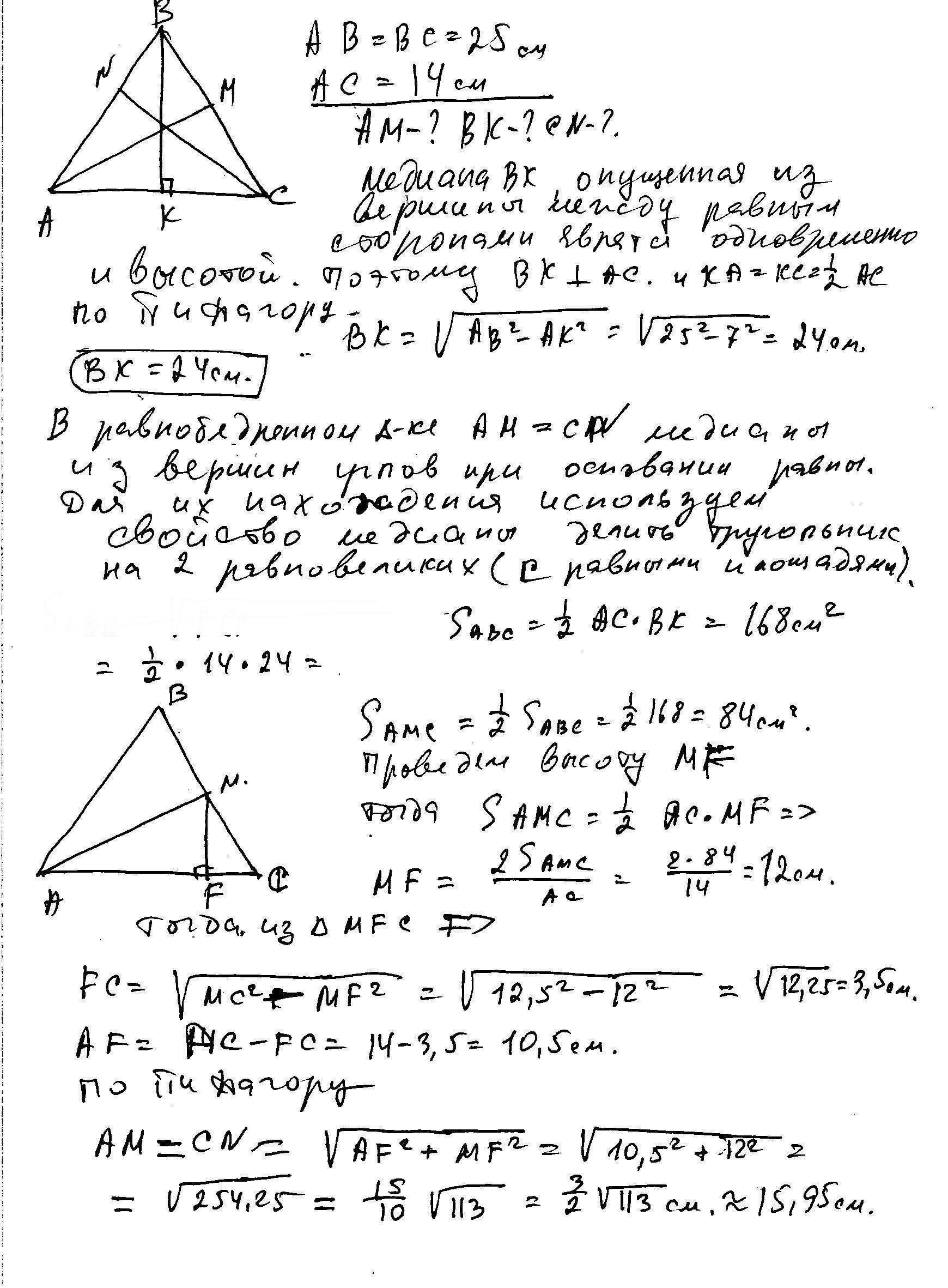 Вычислите медианы треугольника со сторонами 25см 25см 14см