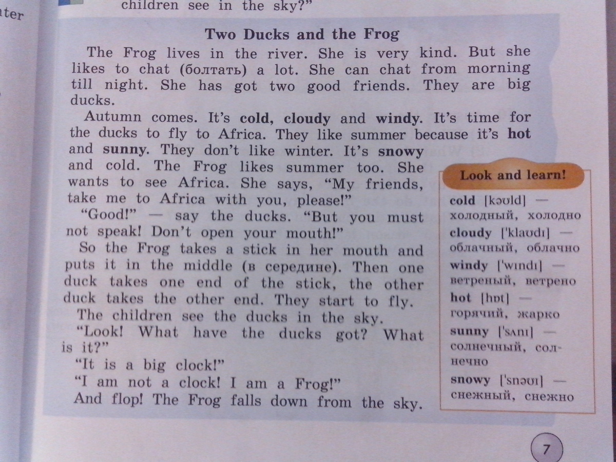 Лягушка живёт в реке. Она очень добрая. Но любит много болтать. Она может болтать с утра до вечера. У неё есть 2 хороших друга. Они две большие утки. Пришла осень. Холодно, облачно и ветрено. Это время что бы утки улетели в Африку. Они любят лето потому что не холодно и солнечно. Они не любят зиму. Снежно и холодно. Лягушка тоже любит лето. Она хочет увидеть Африку. Она говорит "Мои друзья пожалуйста возьмите меня с собой в Африку". "Хорошо" сказали утки. Но ты должна не разговаривать.
