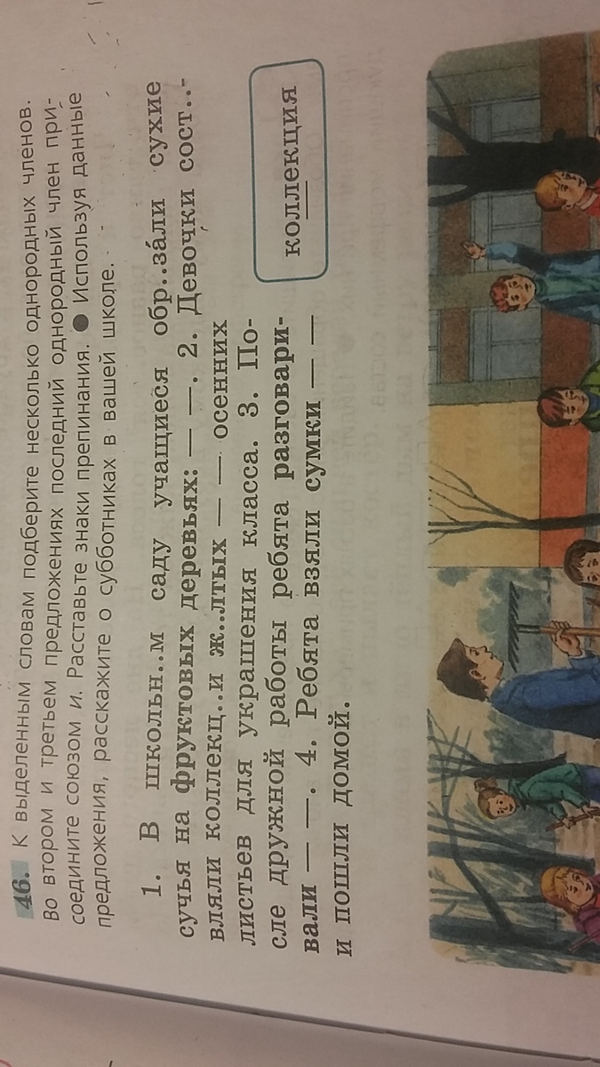 4) свою верхнюю одеждуДа тут множество вариантов, написала, что первое в голову пришло)В школьном саду учащиеся обрезали сухие сучья на фруктовых деревьях: сливовых,грушовых,яблоневых,вишнёвых. .Девочки составляли коллекции жёлтых и красных и зелёных - осенних листьев для украшения класса.После дружной работы ребята разговаривали и шутили и смеялись.Ребята взяли сумки, пакеты и пошли домой