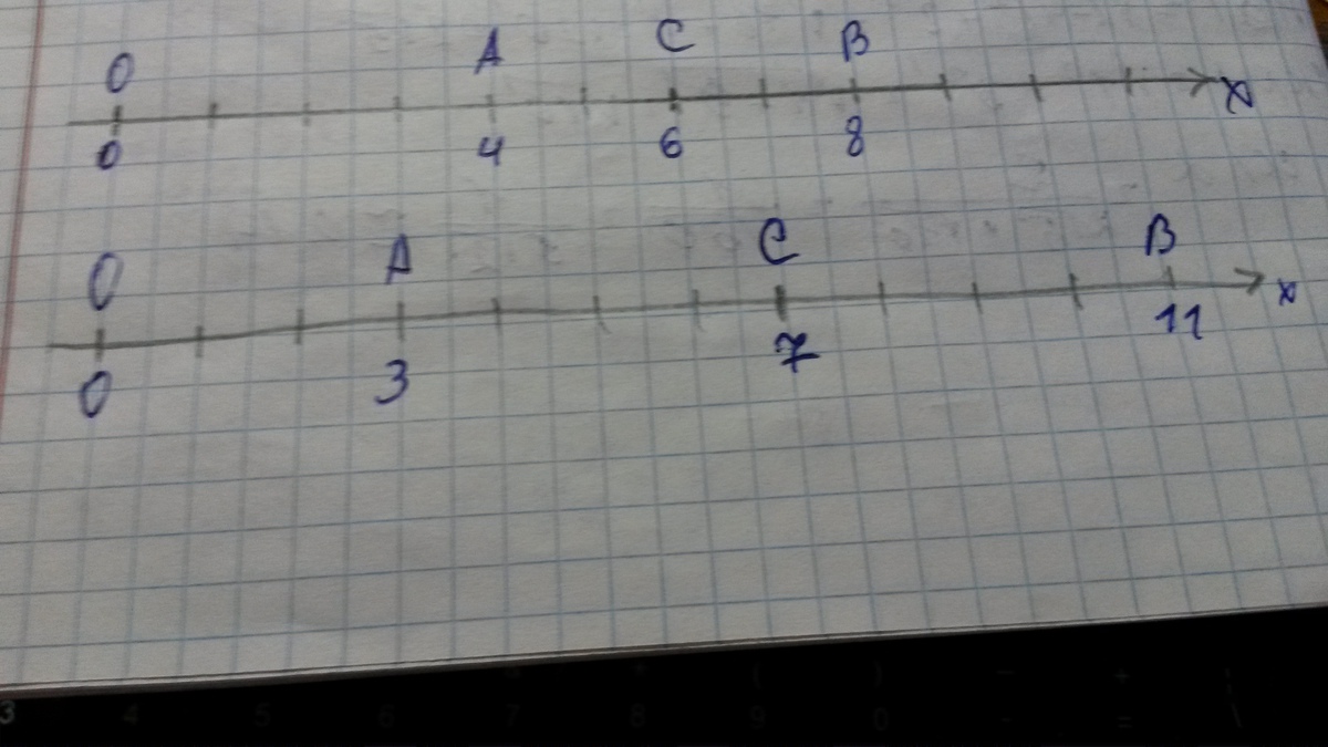 Начертите координатный луч, приняв за единичный отрезок длину двух клеток тетради. На координатном луче отметьте точки:1) A(4) и B(8); 2) A(3) и B(11). Отметьте точку С, являющуюся серединой отрезка АВ. Запишите точку С с координатой.