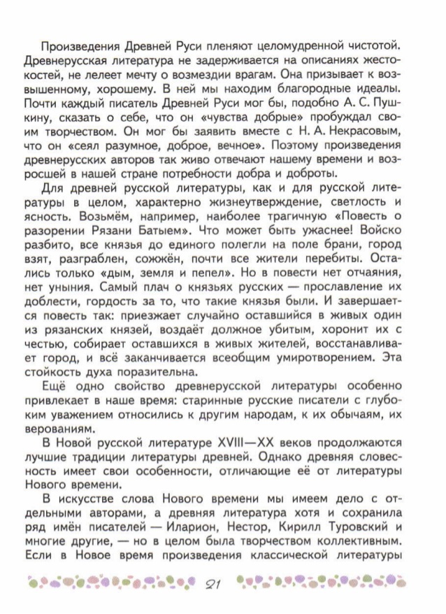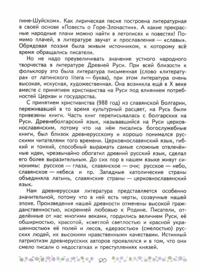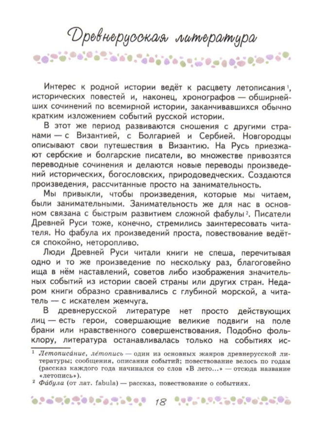 Главный источник наших знаний о древней Руси - средневековые летописи. В архивах, библиотеках и музеях их насчитывается несколько сот. По существу, это одна книга, которую писали сотни авторов, начав свой труд в IX веке и окончив его спустя семь столетий.- С какими произведениями древнерусской литературы вы познакомились ранее? («Повесть временных лет», «Повесть о Петре и Февронии Муромских»)Сначала надо определить, что же такое летопись. В большом энциклопедическом словаре написано следующее: " Историческое произведение, вид повествовательной литературы в России 11 - 17 веков, состояли из погодных записей, либо представляли собой памятники сложного состава - свободные своды".Д. Лихачев писал: «С принятием христианства (988 год) из славянской Болгарии, переживавшей в то время культурный расцвет, на Русь были привезены книги. Часть книг переписывалась с болгарских на Руси. Древнеболгарский язык, называвшийся на Руси церковно-славянским, потому что на нем писались богослужебные книги, был близок древнерусскому и хорошо понимался русскими читателями того времени. Церковно-славянский язык, гибкий и тонкий, способный выражать самые сложные отвлеченные идеи, чрезвычайно обогатил древний русский язык, сделал его более выразительным. До сих пор в нашем языке живут синонимы: русское — глаза, славянское — очи русское —небо, славянское — небеса и пр. Западные католические страны объединила латынь, славянские страны — церковно-славянский язык».