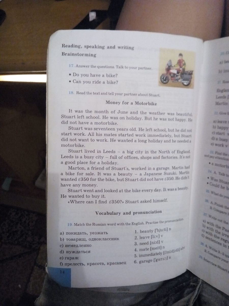 Июнь,погода была прекрасная.Стюарт покинул школу.Он был на каникулах.Но он не был счастлив.У него не было мотоцикла.Стюарту было 17 лет.Он закончил школу,но пока ещё не начал работать.Все его одноклассники немедленно начали работать,но Стюарт не хотел работать.Он хотел длинные каникулы и он нуждался в мотоцикле.Стюарт жил в Лидсе-в большом городе на севере Англии.Лидс-это занятой город-полный магазинами,офисами и заводами.Это не очень хорошее место для каникул.Мартин,друг Стюарта,работал в гараже.У Мартина есть байк для продажи.Красивый японский Сузуки.Мартин хотел 350 евро за байк,но у Стюарта не было 350 евро.У него не было денег вообще.Стюарт приходил и смотрел на байк каждый день.Он был красив.Он хотел купить его.,,Где я могу найти 350 евро?"-спрашивал сам себя Стюарт.