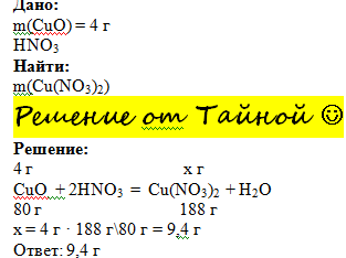 Какова масса нитрата меди, образующегося при взаимодействии оксида меди(II) массой 4г с азотной кислотой?