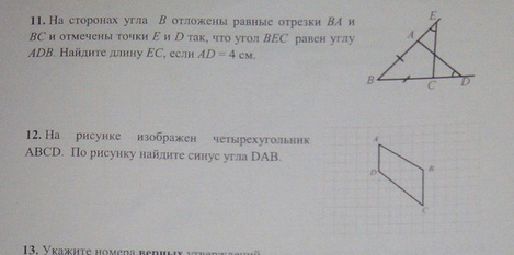 12) Надо рассмотреть тр-к ДАВ. В нем АД = 3, ДВ = 4. По теореме Пифагора находи АВ = 5. Значит, синус ДАВ равено 4/5