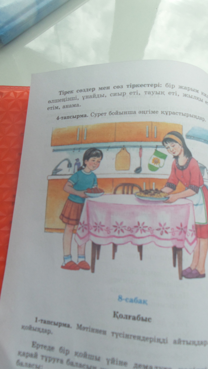 Бүгін мен анама тамақ дайындауға көмектестім. Бүгін қонақ келетіндіктен жұмысқа ерте кірістік. Анам тамақ пікірді. Ал мен оған түрлі дәмдеуіштерді әкелумен болдым. Кешке анам мені қолғанатым деп мақтады.