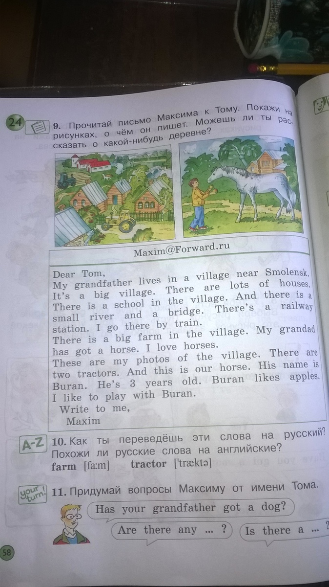 Дорогой Том, мой дедушка живет в деревне рядом со Смоленском. Это большая деревня. Здесь много домов. В деревне есть школа. Так же здесь есть маленькая река и мостик. Есть железнодорожная станция. Я приехал туда на поезде.