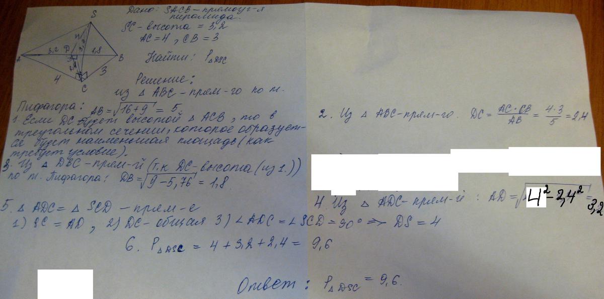 В основании треугольной пирамиды лежит прямоугольный треугольник с прямым углом C и катетами 3 и 4. Высота пирамиды SC равна 3,2. Плоскость,проходящая через ребро SC, дает в пересечении с пирамидой треугольник SDC наименьшей площади.Найдите периметр этого сечения.