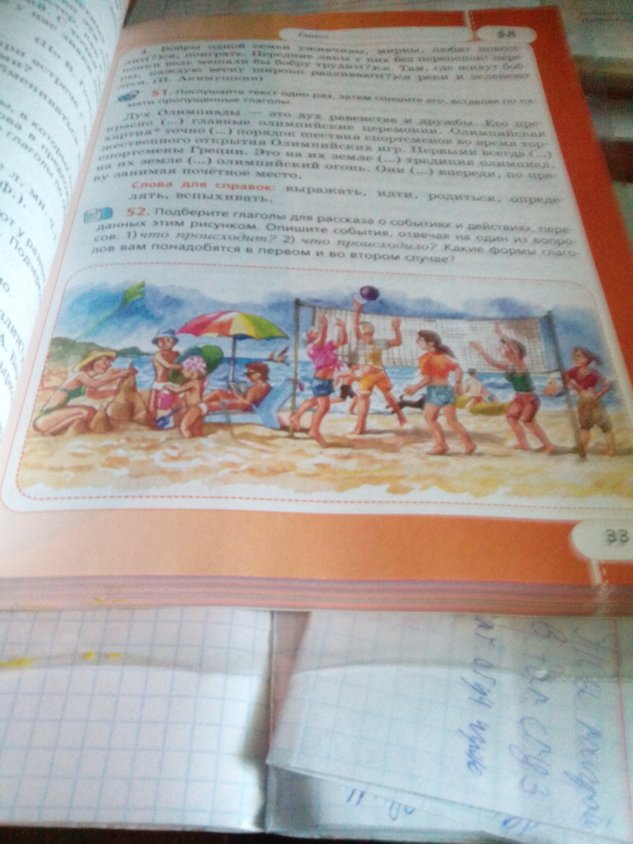 помоги те пожалуйста задание 52 подбери глаголы для рассказа о событиях и действиях переданных этим рисунком опишите события отвечая на один из вопросов 1) что происходит? 2) что происходило? какие формы глаголов вам понадобится в первом и во втором случае?