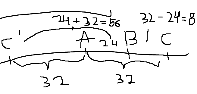 точки A,B и C лежат на одной прямой. Найдите длину отрезка BC,если AB=24см, AC=32 см. Сколько решений имеет задача?