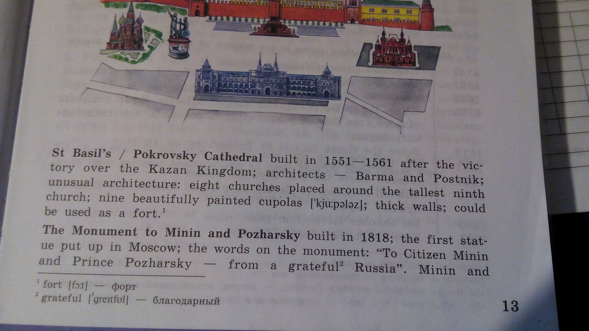 Собор Василия Блаженного был построен в 1551-1561 годах после победы над Казанским ханством. Архитекторы - Барма и Постник; необычная архитектура: восемь церквей расположены вокруг самой высокой девятой церкви; купол девятой красиво раскрашен; толстые стены; мог бы использоваться как форт.