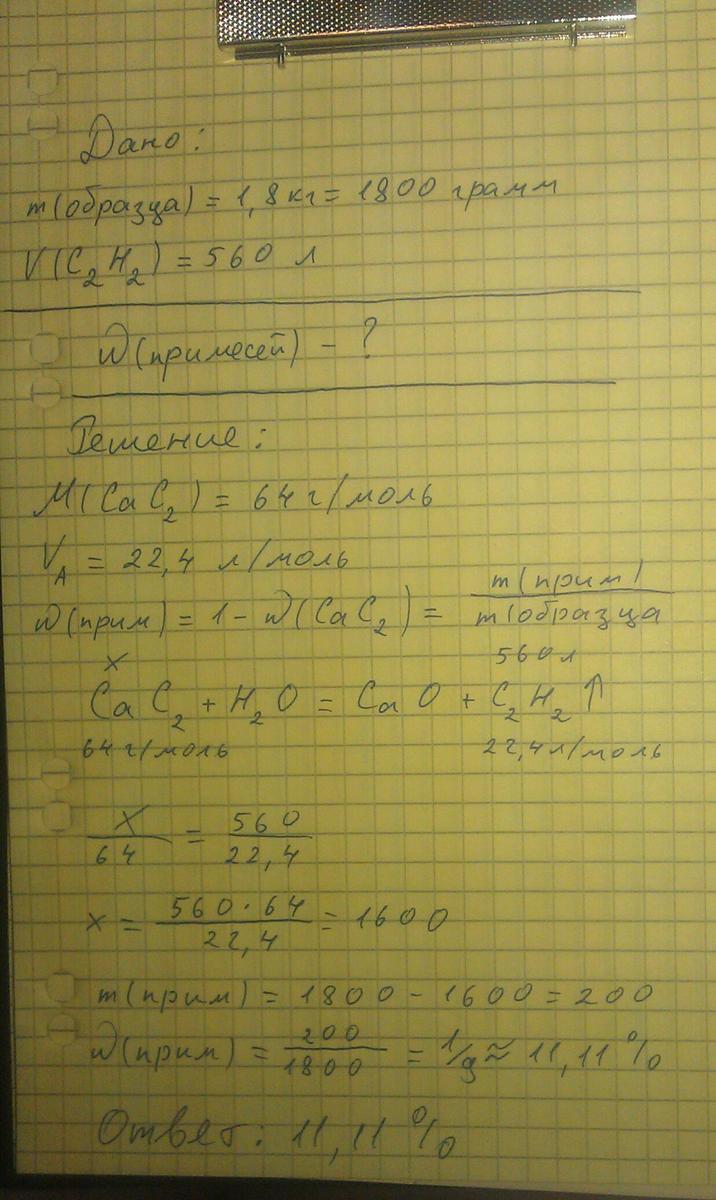 Помогитеее! При полном разложении образца карбида кальция массой 1,8 кг с водой образовался ацетилен объёмом 560 л. Определить содержание примесей в карбиде кальция (реакция: СаС2+Н2О-> Ca(OH2)+C2H2)