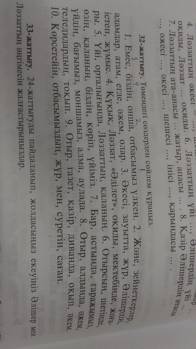 Біздің отбасымыз онша үлкен емес. Олар егде адамдар, атам және әжем зейнеткерлер. Әлішердің әкесі зауытта жұмыс істеп жүр. Ләззат жоғары "Әділет" құқық мектебінде оқиды. Ләззаттың үйі қаланың орталығында. Өзің көріп отырсың, біздің үйіміз қаланың шетінде. Уйдің астында гаражымыз, аулада алма бағымыз, моншамыз бар. Әжем теледидардың алдында тоқып отыр. Қазір әкем диванда газет оқып отыр. Жүр мен саған отбасымыздың суретін крсетейін.