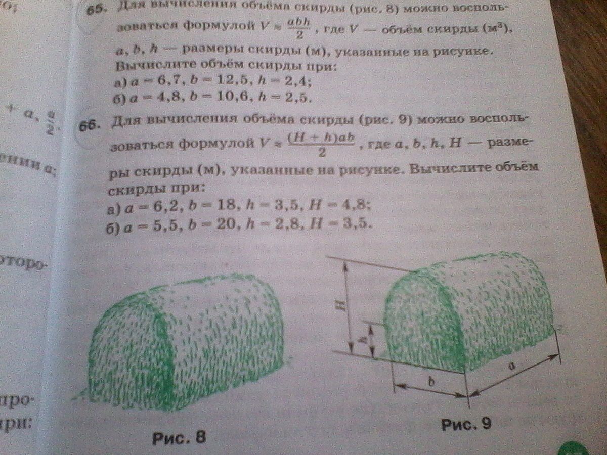 И там ещё на картинке, задания видны , это 65 . И мне ещё 66 нужно решить зделайте пожалуйста!!!!!!!!для вычисления обьема скирды можно воспользоватся формулой V= abh/2 , где V объём скирды (m³),a,b,h,-размеры скирды (m),указанные на рисунке.