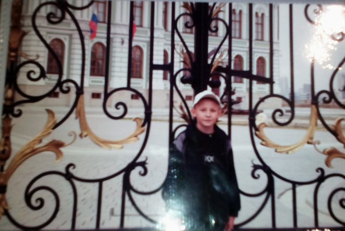 In the pictures I can see boy . He is a dressed in dark tracksuit and on the head is white cap .Behind the boy I can see black gate with gold elements.Through the gate I can see large building with Russian flag.The building is white and green with large window.The building looks like state building.
