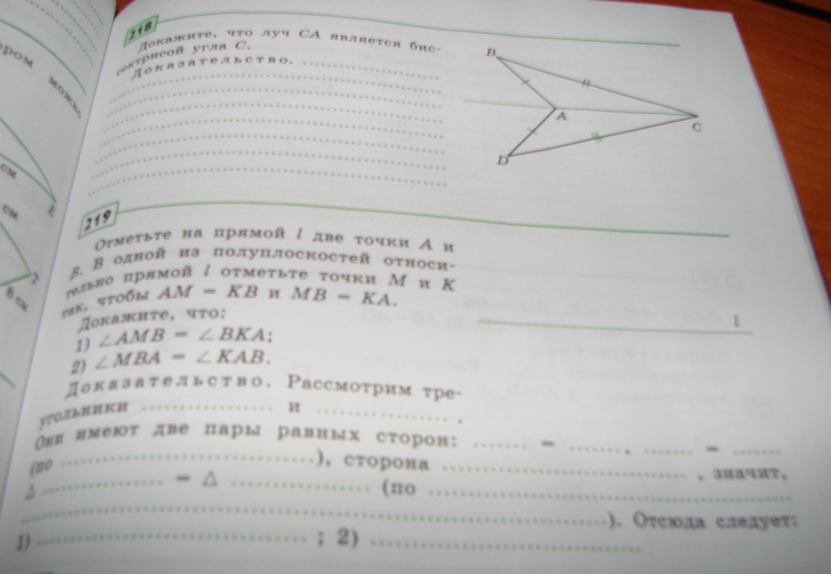 219)треугольники AMK и BKM, равные стороны даны в условиии, MKобщая, треугольники равны по третьему признаку, отсюда следует равенство нужных углов