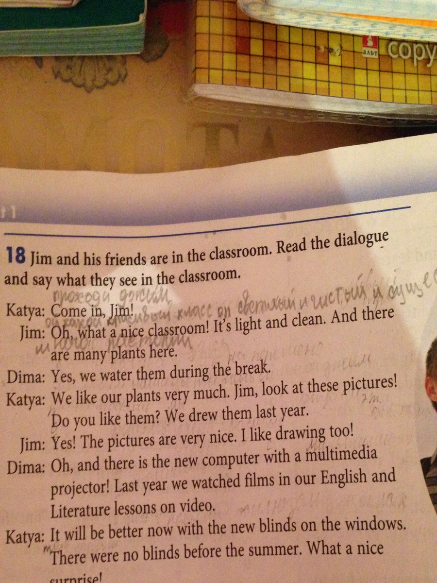 Джим и его друзья в классе. Прочитал диалог и скажи что они видятДжим и его друзья в классе. Прочитал и скажи что они видят в классе