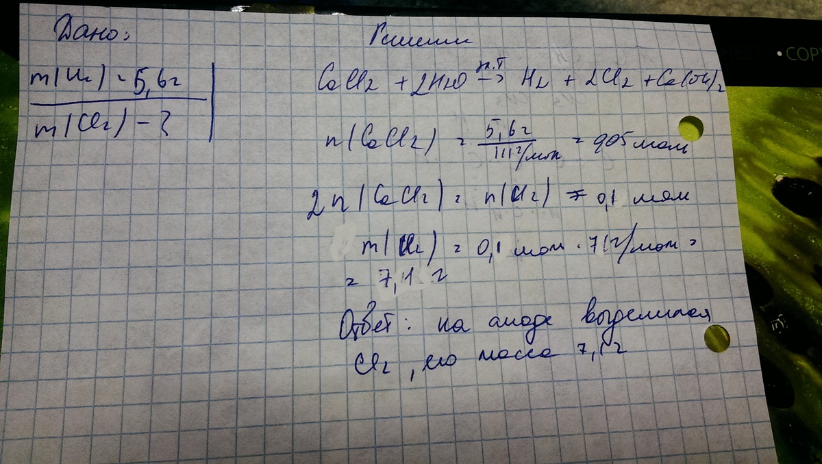 При электролизе раствора хлорида кальция на катоде выделилось 5,6 г. водорода. Какой газ выделился на аноде и какова его масса?