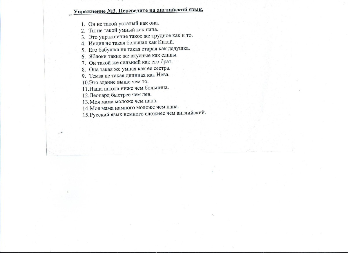 1. It is not as tired as the ona.2.ty not as smart as the papa.3.eto exercise the same hard as to.4.Indiya not as big as Kitay.5.Ego grandmother not as old as the dedushka.6. Apples are the same as the delicious slivy.7.on as strong as his brat.8.Ona the same as the smart sestra.9.Temza it is not as long as the building is higher than Neva.10.Eto to.11.Nasha school less than bolnitsa.12.Leopard faster than lev.13.Moya mother younger than my mother papa.14.Moya much younger than papa.15.Russky language a bit more difficult than English.