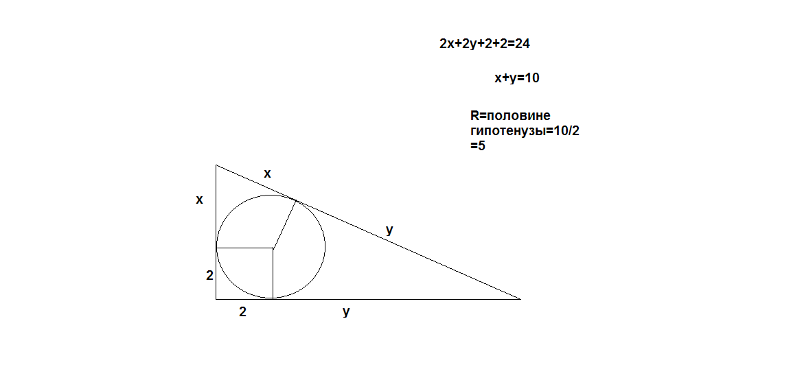 знайдіть радіус описаного навколо прямокутного трикутника кола якщо радіус вписаного в ньогог кола 2 см а периметр 24 см