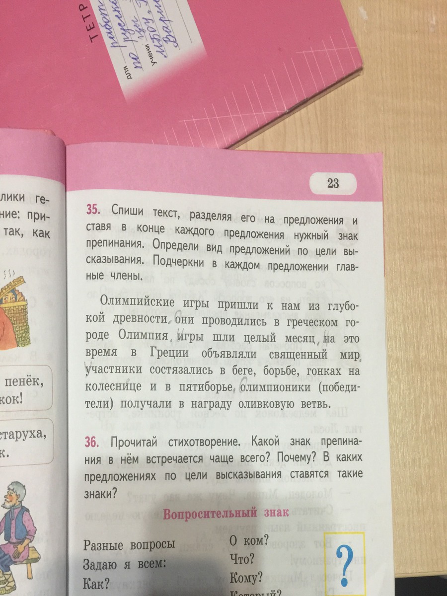 Олимпийские игры пришли к нам из глубокой древности(подлежащее игры, сказуемое пришли, повествовательное). Они проводились в греческом городе Олимпия(подлежащее они, сказуемое проводились, повествовательное). Игры шли целый месяц(подл. игры, сказ. шли, повествовательное). На это время в Греции объявляли священный мир( подлежащего нет, сказуемое объявляли, повествовательное). Участники состязались в беге, борьбе, гонках на колеснице и в пятиборье(подлеж. участники, сказ. состязались,повествовательное). Олимпионики (победители) получали в награду оливковую ветвь(подл. олимпионики, сказ. получали, повествовательное).