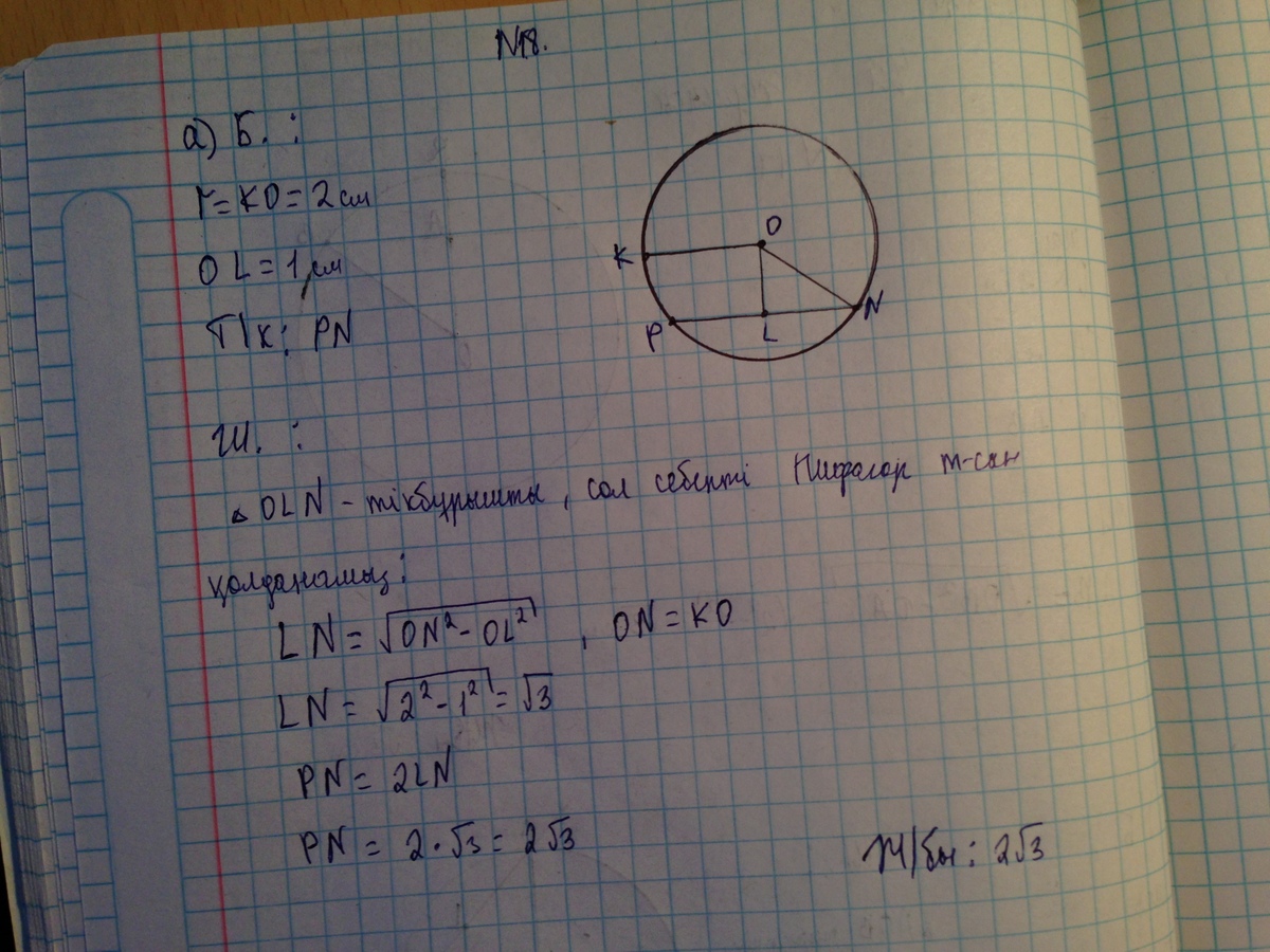 дан шар с радиусом R. В нем проведена хорда а)чему равна ее длина, если радиус равен 2, а хорда удалена от центра на 1? б)чему равна длина хорды, если она видна из центра под углом 30, 120, альфа?