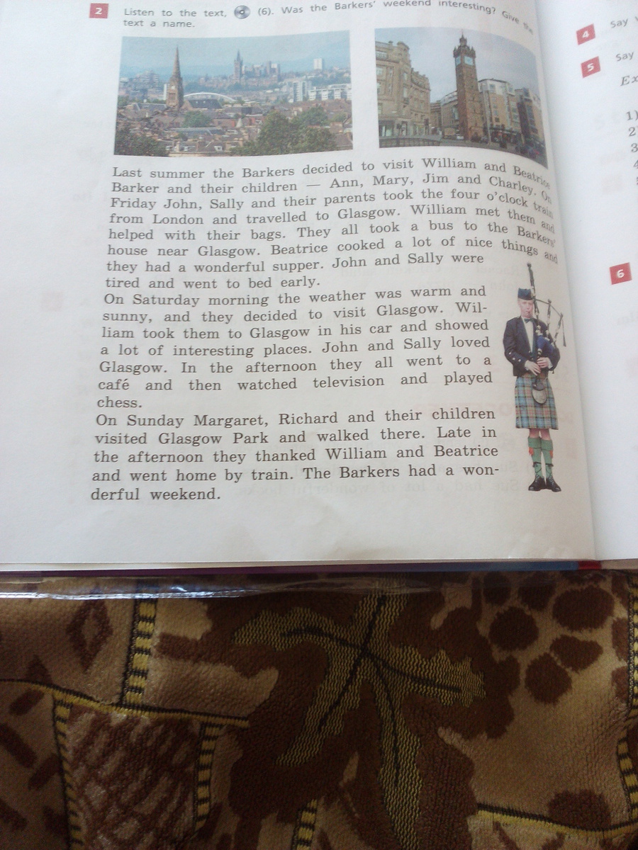 Прошлым летом Баркерс решили посетить Уильяма и Баркер и Энн Мэри, Джим и их Ch дети Фрида Джон, Салли и их родители приняли четырех К тр из Лондона и отправился в Глазго. Уильям встретил й помог их все взяли автобус к B возле Глазго. Беатрис приготовленные много хороших тонкий а они имели замечательный ужин. Джон и Салли были и пошел спать рано. тепло и субботу утром погода была солнечная, и они решили посетить показали Лиам взял им в Глазго в своей машине и много интересных мест. Джон и Салли любила Глазго В днем они все пошли в кафе, а затем смотрел телевизор и играл в шахматы. дети воскресенье Маргарет, Ричард и их Поздно посетил Глазго парк и пошел туда. во второй половине дня они поблагодарил Уильяма и Беатрис и пошел домой на поезде. Зазывалы было won- derful выходные.