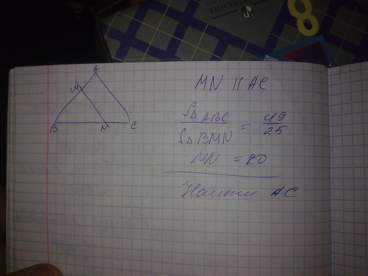 Первое - все просто. Соотношение площадей равно квадрату коэффициента подобия. В данном случае квадрат коэф. подобия равен 25/49 = > коэф подобия равен 5/7, то есть MN/AC=5/7=20/x решаем эту пропорцию и получаем AC = 28