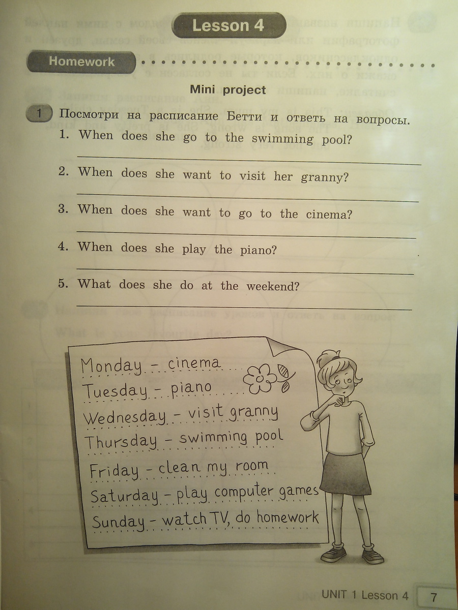 ответить на вопрос.When does she go to the swimming pool?When does she want to visit her grenny?When does she want to go to the cinema?When does she play the piano?What does she do at the weekend?