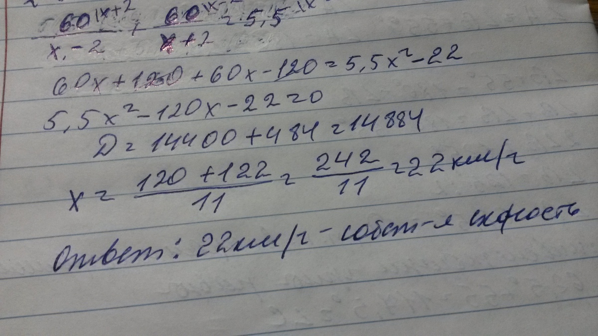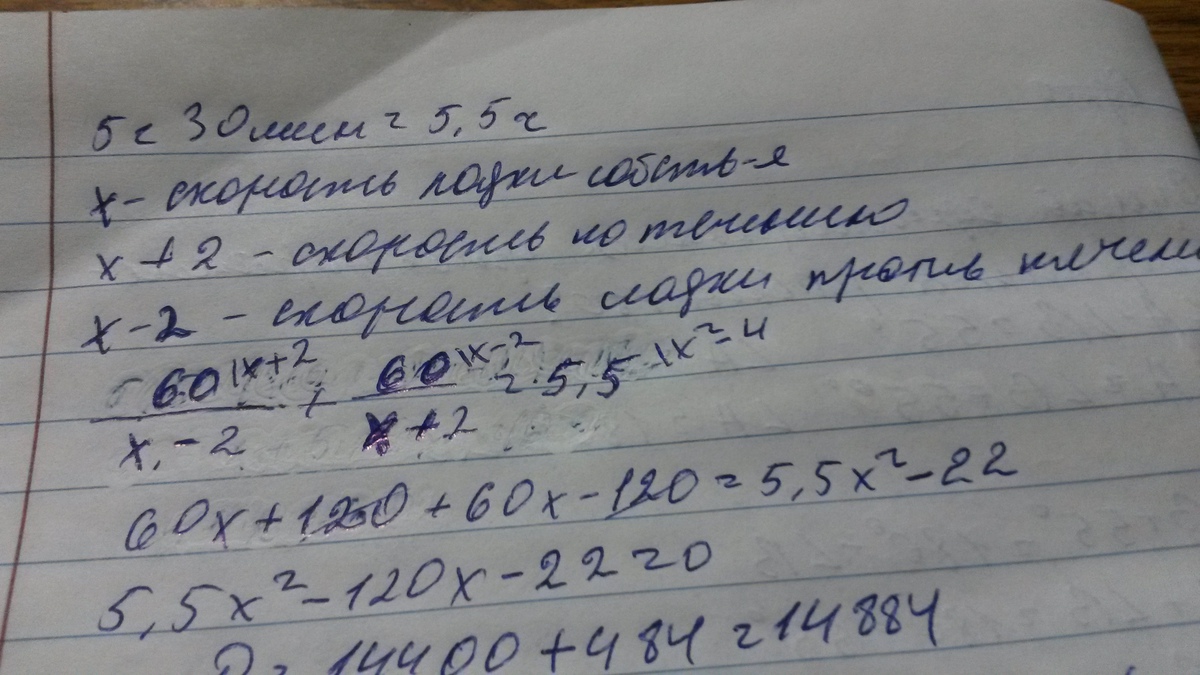 расстояние между двумя пунктами по реке равна 60 км. Моторная лодка, не останавливаясь, прошла расстояние между двумя пунктами по реке туда и обратно за 5 ч 30 мин. Определите собственную скорость лодки, если скорость течения реки равна 2 км/ч