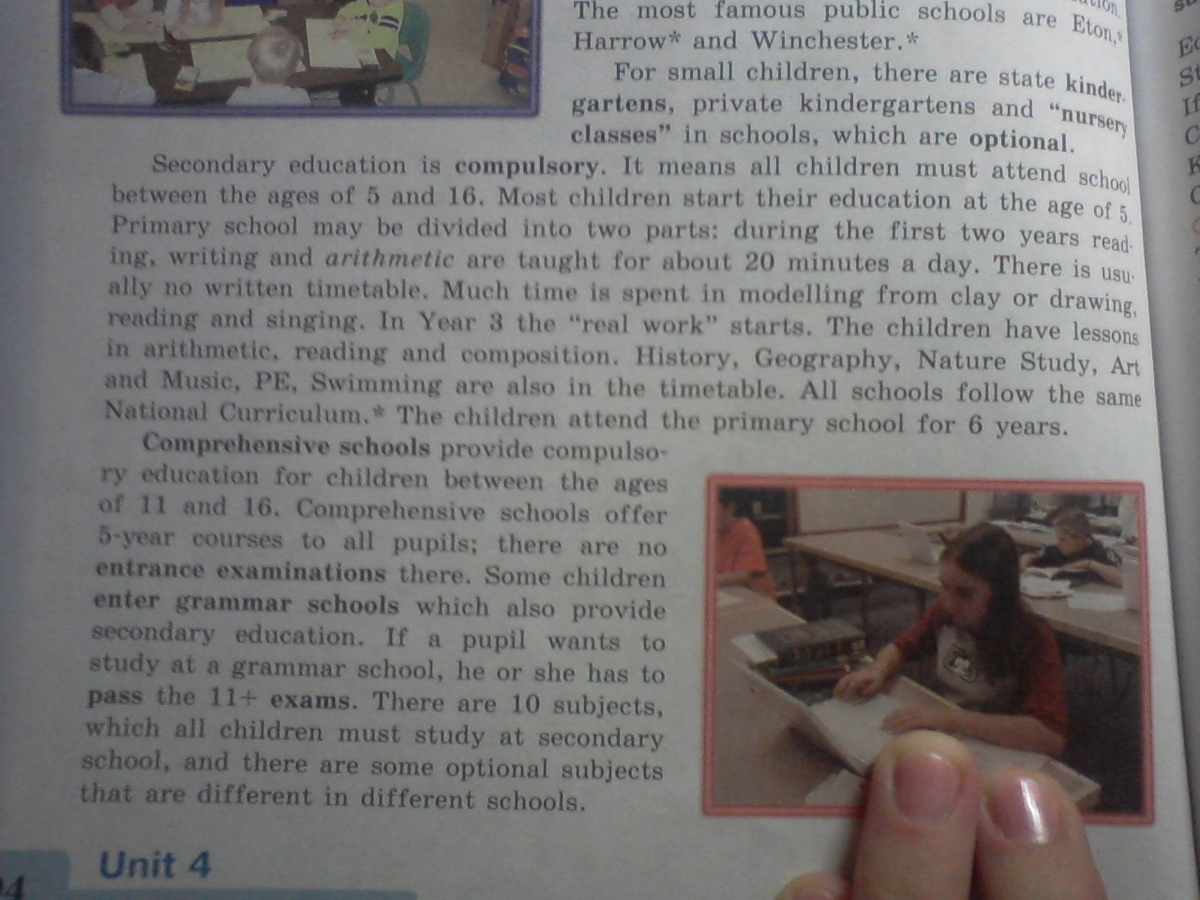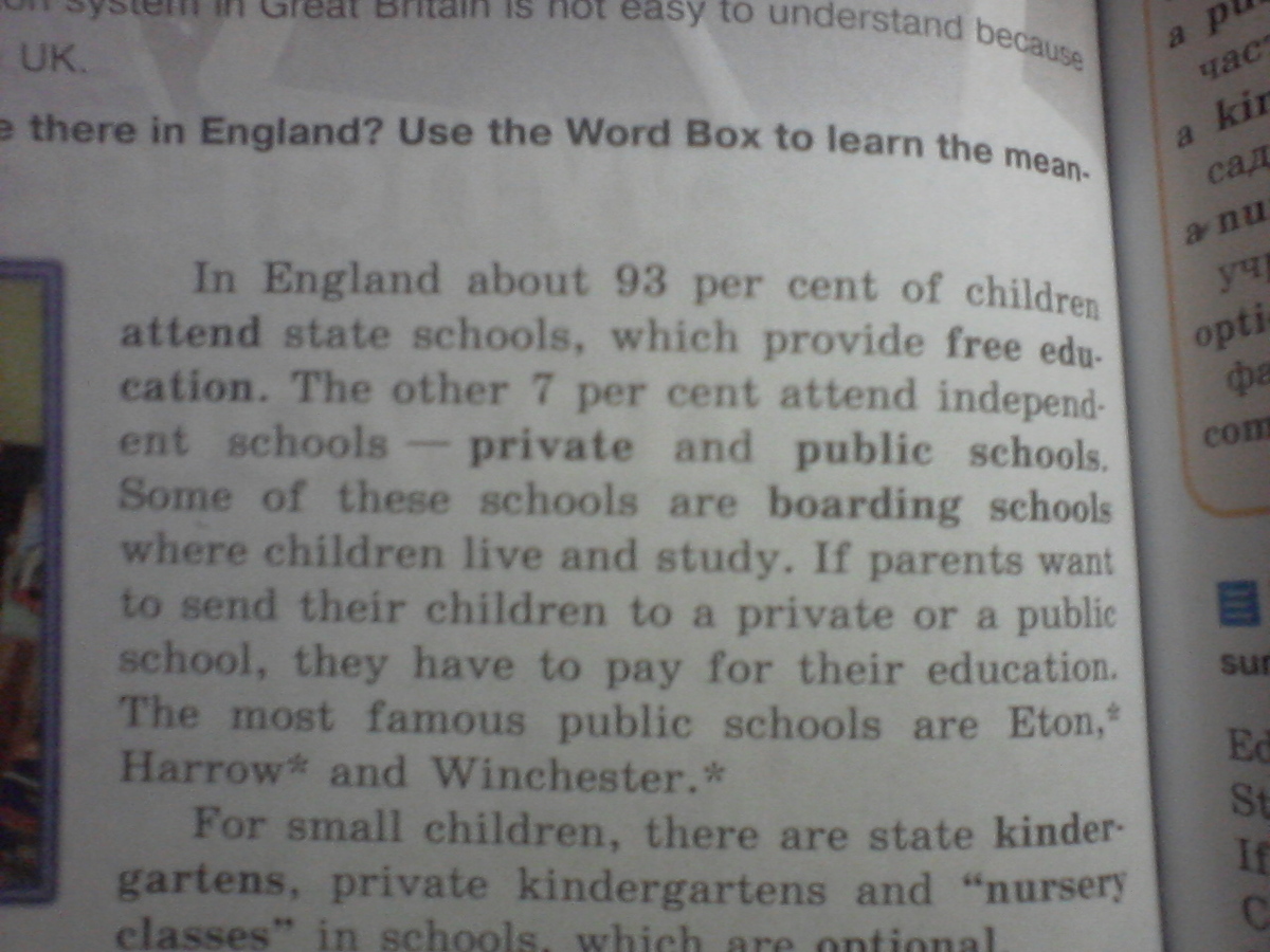 (Это первое вложение)В Англии около 93 процентов детей посещают государственные школы,в которых бесплатное обучение.Другие 7 процентов посещают независимые школы-приватные и общественные школы.В большинстве этих школ дети могут жить и учиться.Если родители хотят чтобы их дети учились в одной из этих школ,то они должны платить за образование/
