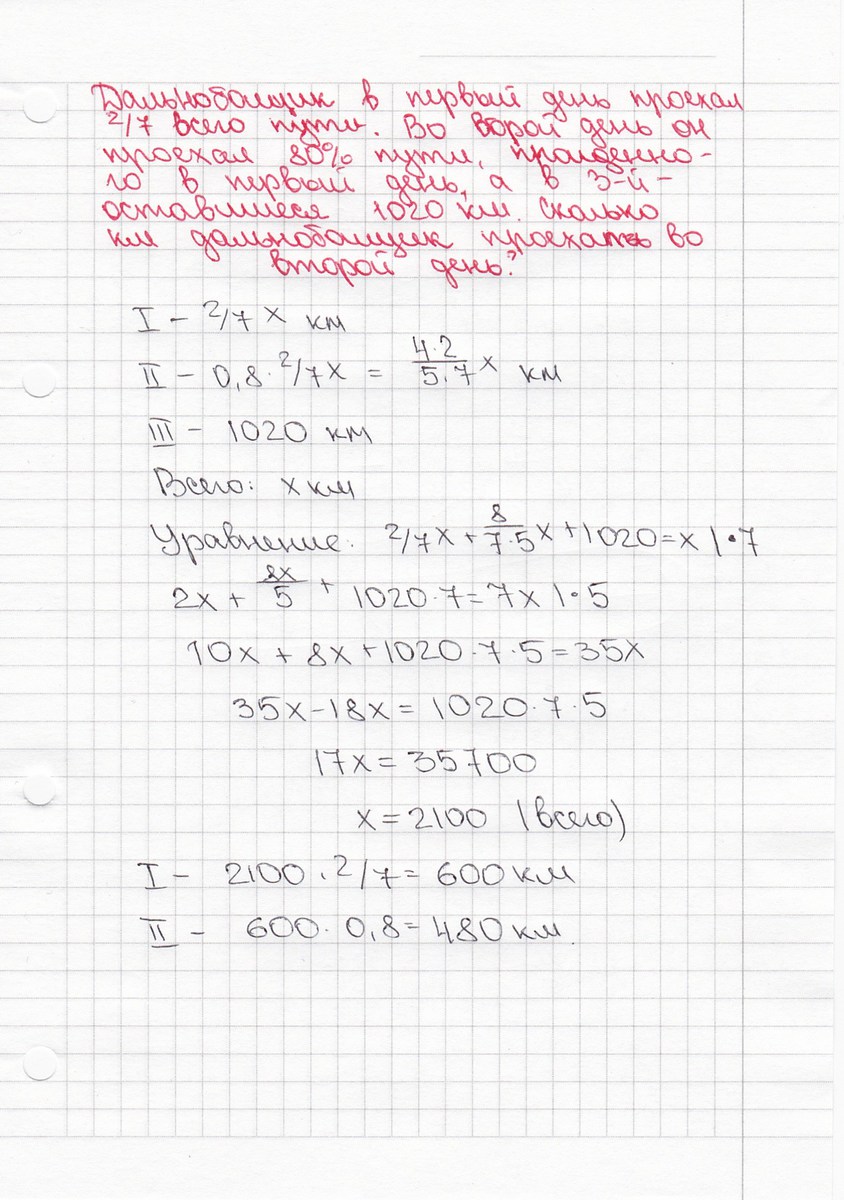задача по алгебре 7 класс, дальнобойщик 1 день проехал 2|7 всего путей. во 2 день проехал 80% пути,пройденого в 1 день,а в 3 день-оставшиеся 1020 км