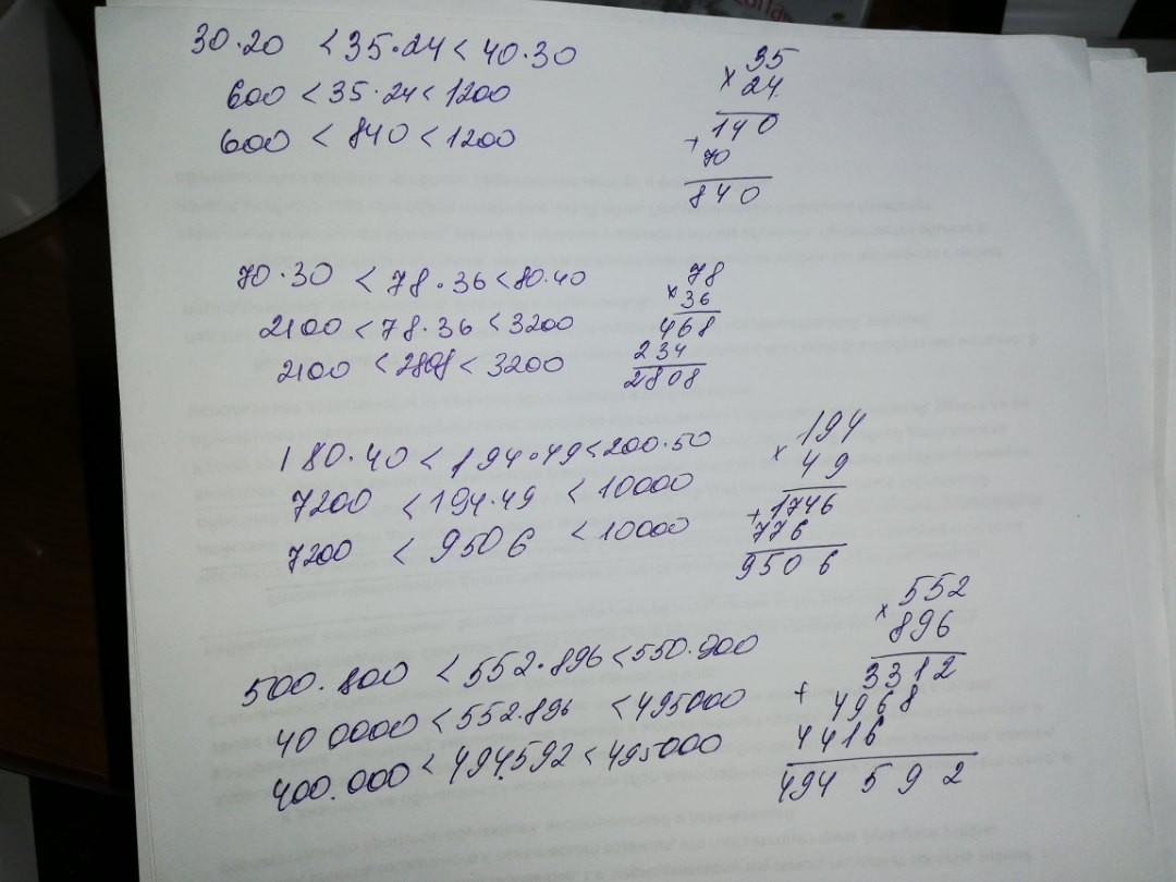 Сделай оценку произведений .Проверь полученный результат с помощью вычислений.35*24 78*36 194*49 552*896