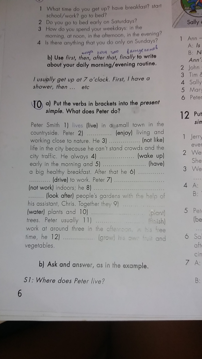 a) Put the verbs in brackets into the present simple. What does Peter do? Peter Smith 1) lives (live) in a small town in the (enjoy) living and countryside. Peter 2) working close to nature. He 3 life in the city because he can not stand crowds and the city traffic. He always wake up early in the morning and 5) have a big healthy breakfast. After that he ......... (drive) to work. Peter 7) (not work) indoors, he 8) look after people's gardens with the help of his assistant Chris. Together they 9 (water) plants and 10) (plant) trees. Peter usually 11 (finish) work at around three in the afternoon. 12 In his free time, he grow his own fruit and vegetables.