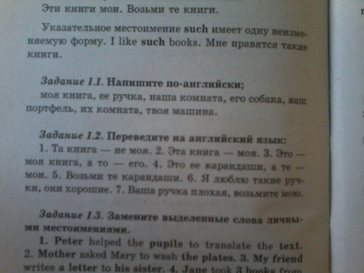 1. That book is not mine. 2. This book is mine. 3. This book is mine, but that - his. 4. These are her pencils, and those are mine. 5 Take those pencils. 6. I like such pen, they are good. 7. Your pen is bad, take mine.
