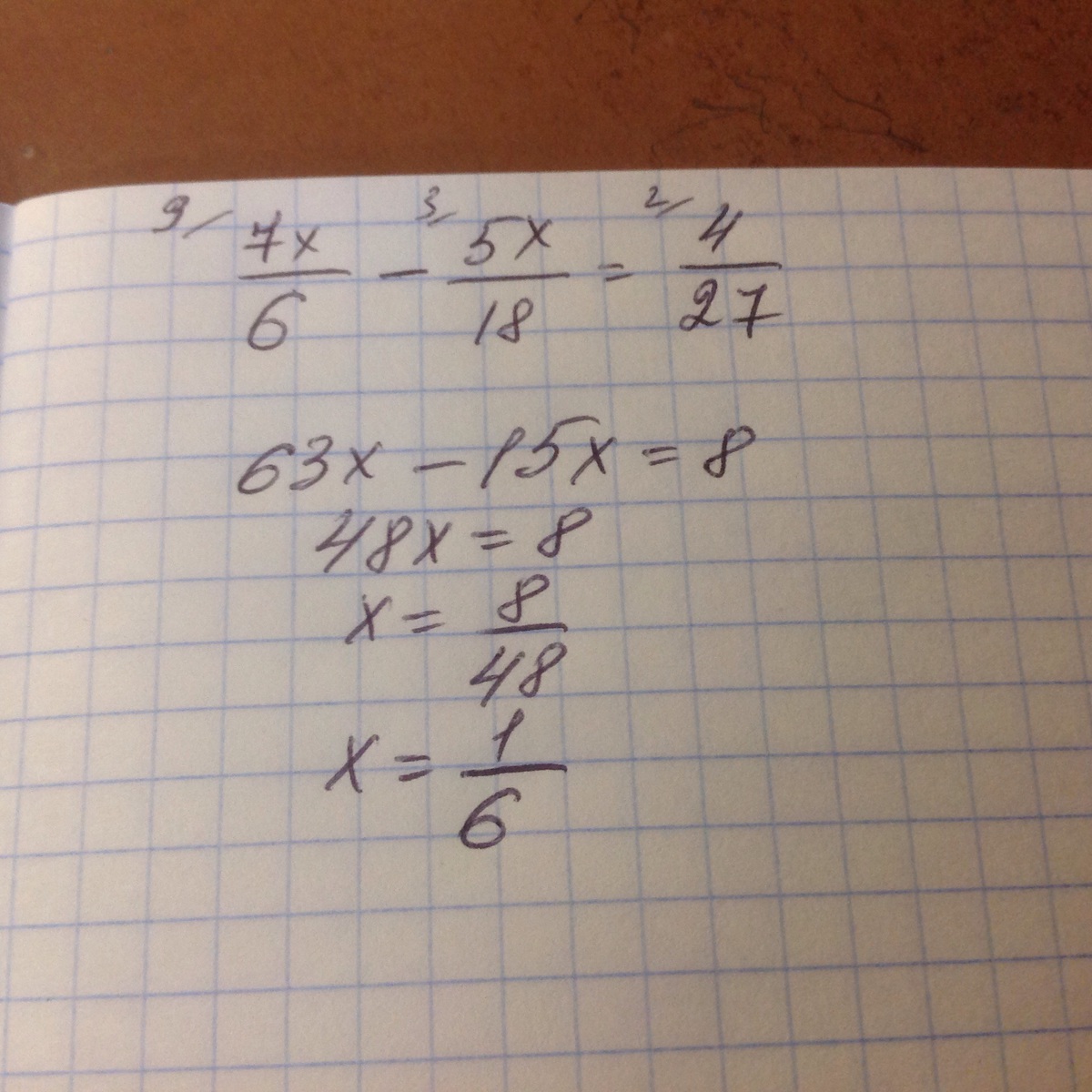 Решите уравнение, срочно, 7x/6 -5x/18= 4/27