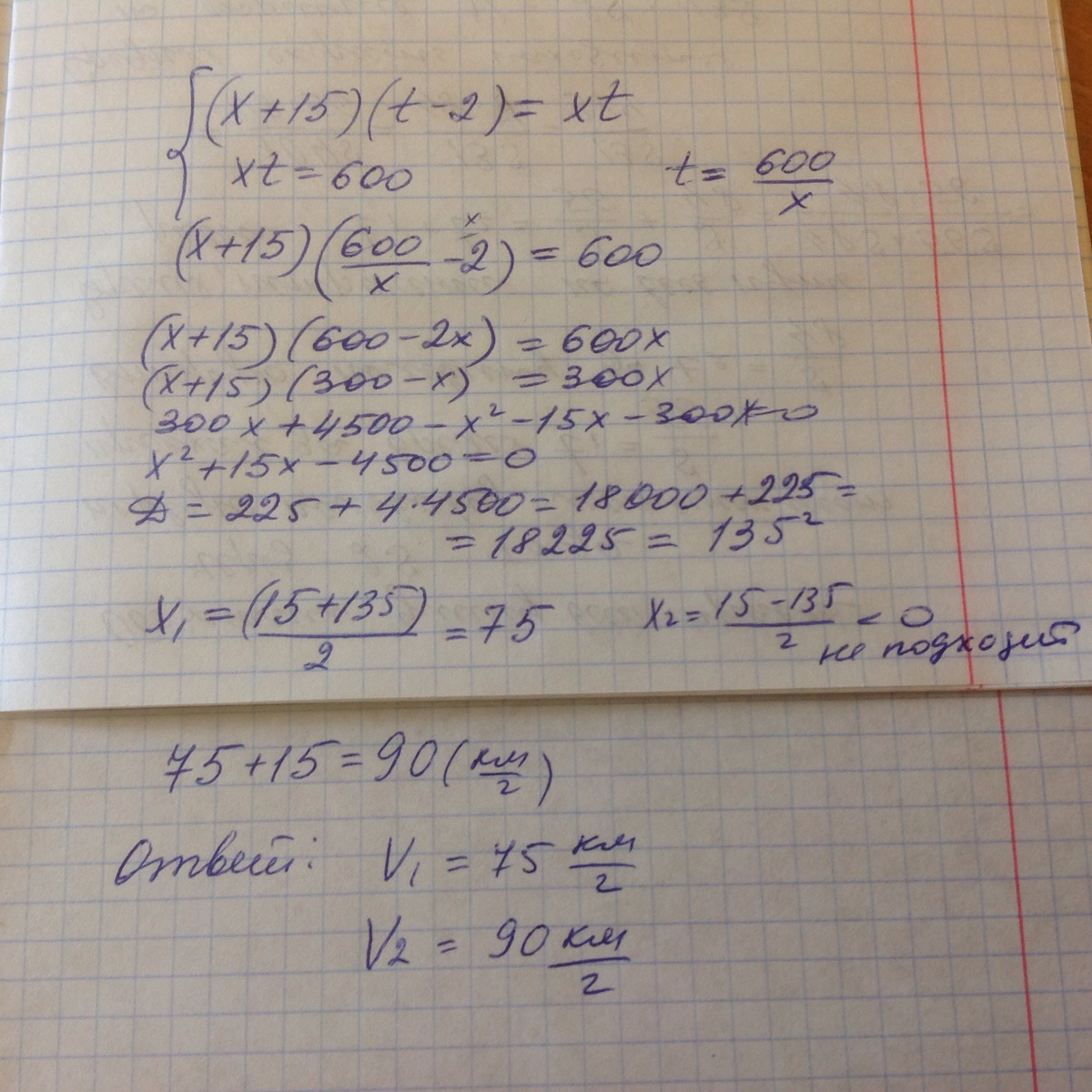 Два автомобілі виїжджають одночасно з одного міста в інше. Швидкість першого на 15 км/годменша від швидкості другого, тому перший автомобіль приїжджає на місце на 2 год пізніше від другого. Знайдіть швидкість кожного авто, якщо відстань між містами = 600 км.