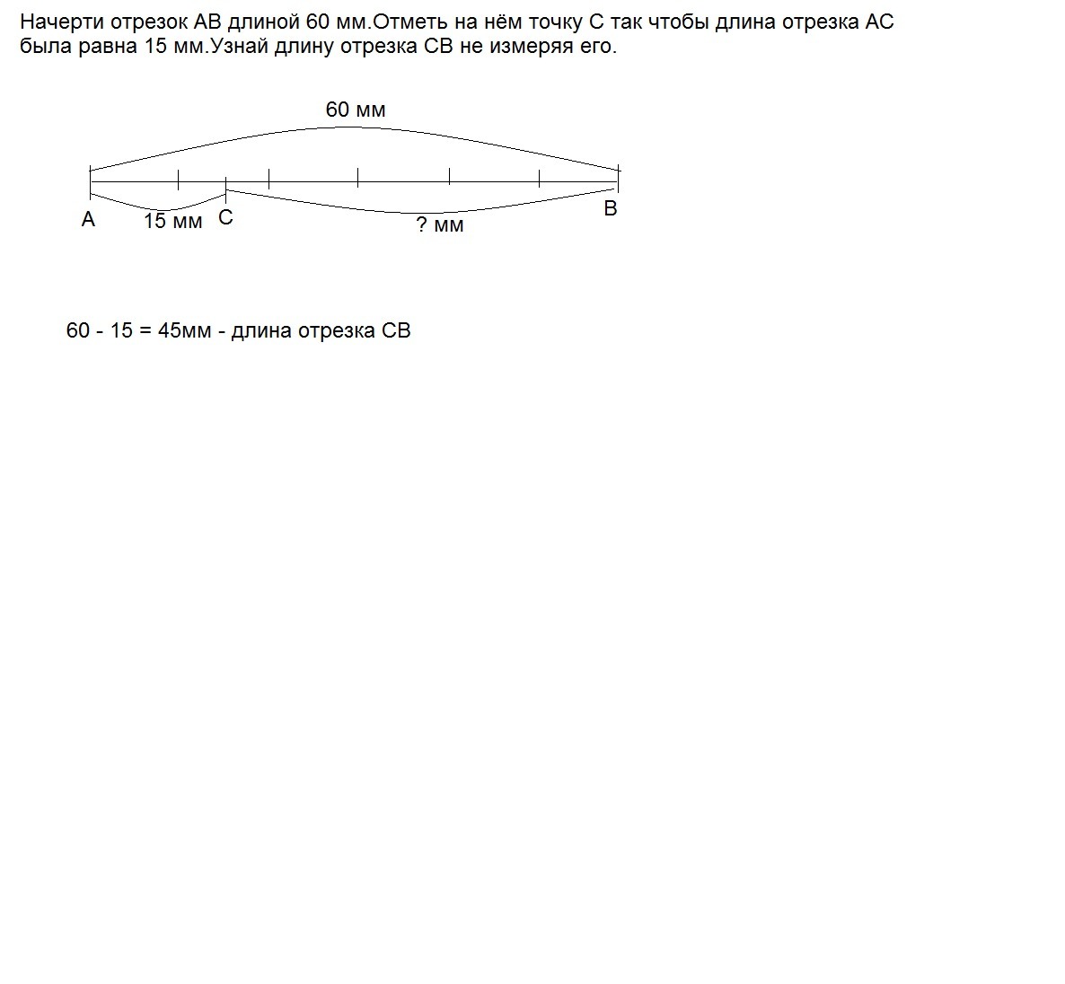Начерти отрезок АВ длиной 60 мм.Отметь на нём точку С так чтобы длина отрезка АС была равна 15 мм.Узнай длину отрезка СВ не измеряя его.Помогите заданка по математике 3 класс