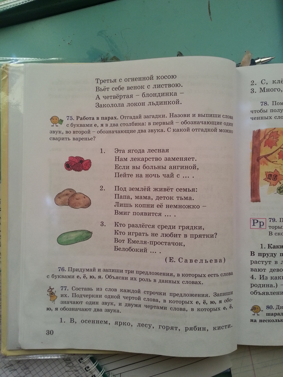 Помогите пожалуйста. работа в парах. отгадай загадки. назови и Выпиши слова с буквами е, я в два столбика: в первые обозначающие один звук, - обозначающие два звука.