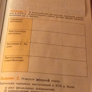История 7 класс! В выступлениях различных категорий населения в 17 веке использовались самые разные формы протеста. Запишите их в таблицу. ТАБЛИЦА В ФОТО