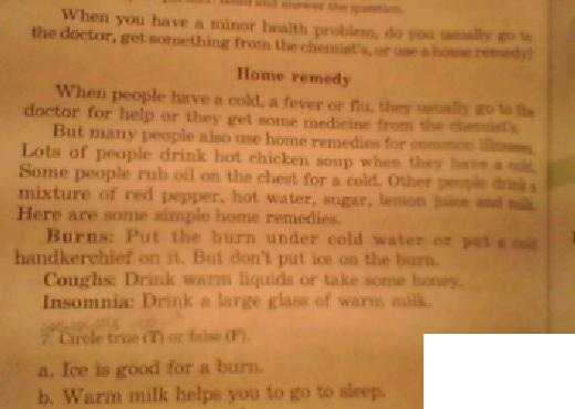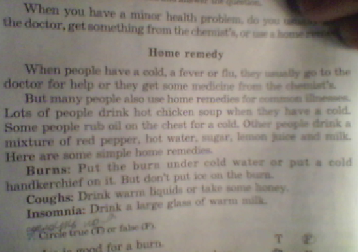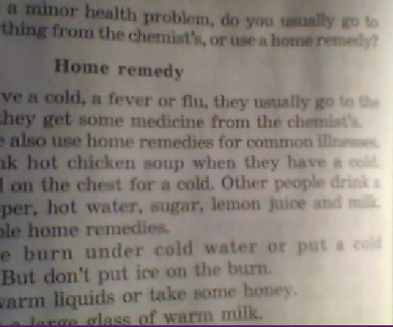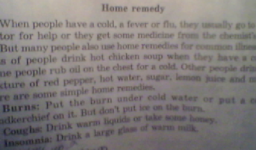 Но также, многие люди пользуются домашними средствами для распрастранненых болезней. Многие люди пьют горячий куринный суп когда они больны Некоторые люди протирают грудь маслом(жиром). Другие пьют микстуры - красный перец, горячую воду, сахар, лимонный сок или молоко. Вот некоторые домашние средства(лечения).