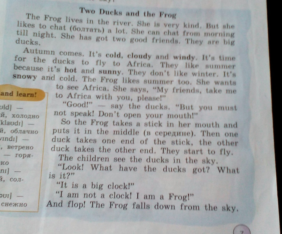 Приходит осень.Холодно, облачно и ветрено.Пора уткам лететь в Африку.Они любят лето потому что летом жарко и солнечно.Они не любят зиму.Снежно и холодно.Лягушка тоже любит лето.Она хочет увидеть Африку.Она сказала:"Мои друзья, Возьмите меня в Африку, пожалуйста!" "Хорошо!"-Лягушка положила палку в рот и взяла ее в середине.Потом утка взяла один конец палки,другая утка взяла другой конец.Они полетели.