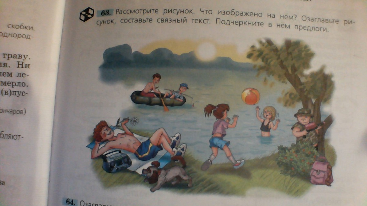 Было лето!Все были заняты своим делом.Дима загарал на пляже,слушал музыку,а его собака с ним играла!Девочки играли в мяч!Мальчики подавали и ловили рыбу на лодке,а какой-то не хороший мальчик пулялся своим игрушечным пистолетом!