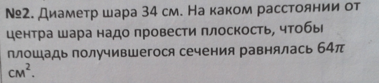 Получим прямоугольный треугольник с катетом, равным радиусу r сечения и гипотренузой, равной радиусу R шара.Он равен половине его диаметра =34:2=17 см