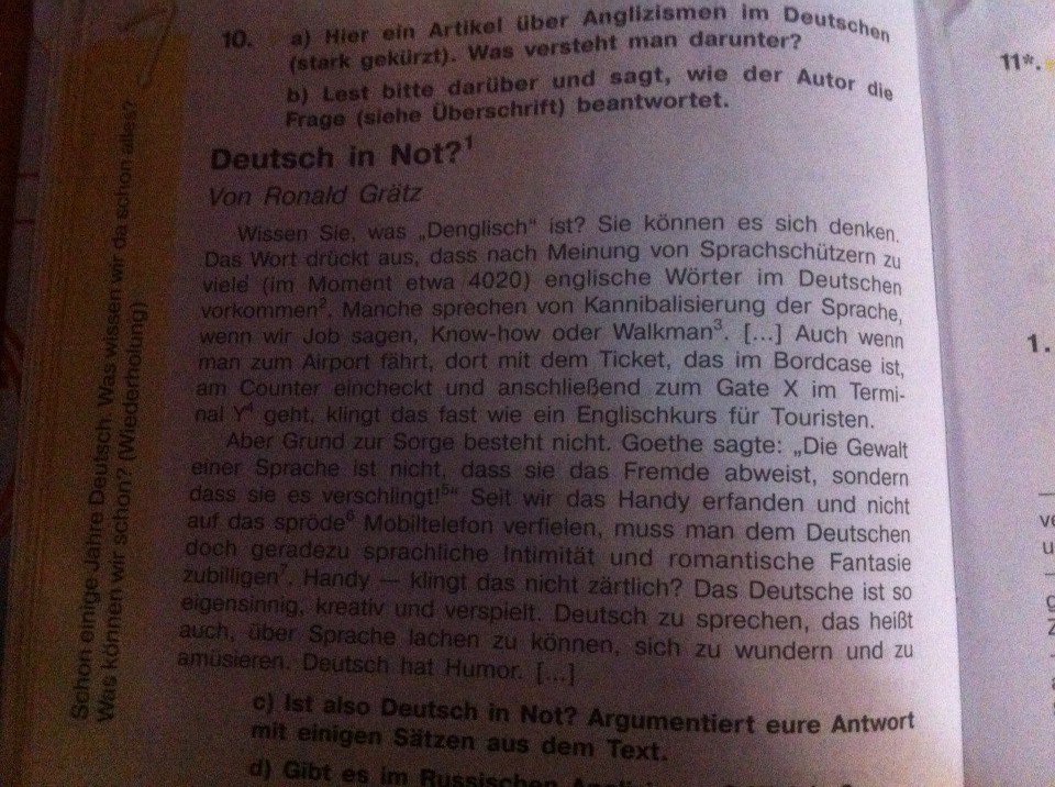 Вы знаете, что такое "Дэнглиш"? Вы можете подумать. Слово означает слишком большое, по мнению защитников языка, количество английских слов в немецком (в настоящее время около 4020 слов). Некоторые говорят о языковом каннибализме, когда мы употребляем такие слова, как "Job", "Ноу-хау" или "Уокман". Или, если мы едем в аэропорт, то идем с "тикетом" в бордкейсе "зачекиниться у каунтера" и, наконец, идем к гейту Икс в терминале Y. И это звучит как курс английского языка для туристов.