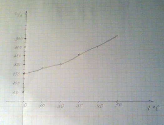 №5 Кривая растворимости строится в системе координат. По оси х можно отложить значения температуры, а по оси у - значения растворимости, выбрав по каждой оси цену деления, например, как на картинке.